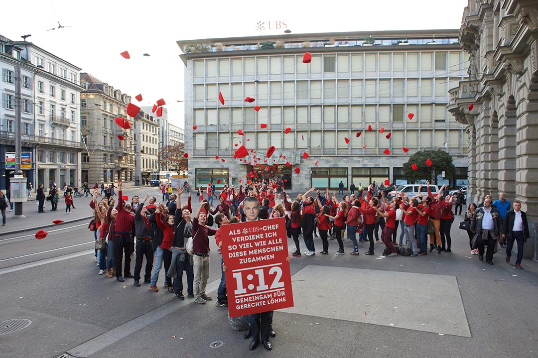Die Notwendigkeit eines Mindestlohns sichtbar gemacht: JUSO-Demonstranten zeigen auf dem Paradeplatz eindrücklich, wie viel Sergio Emotti verdient – nämlich soviel, wie die gesamte Menschenkette hinter dem Pappkamerad des UBS-CEOs zusammen.